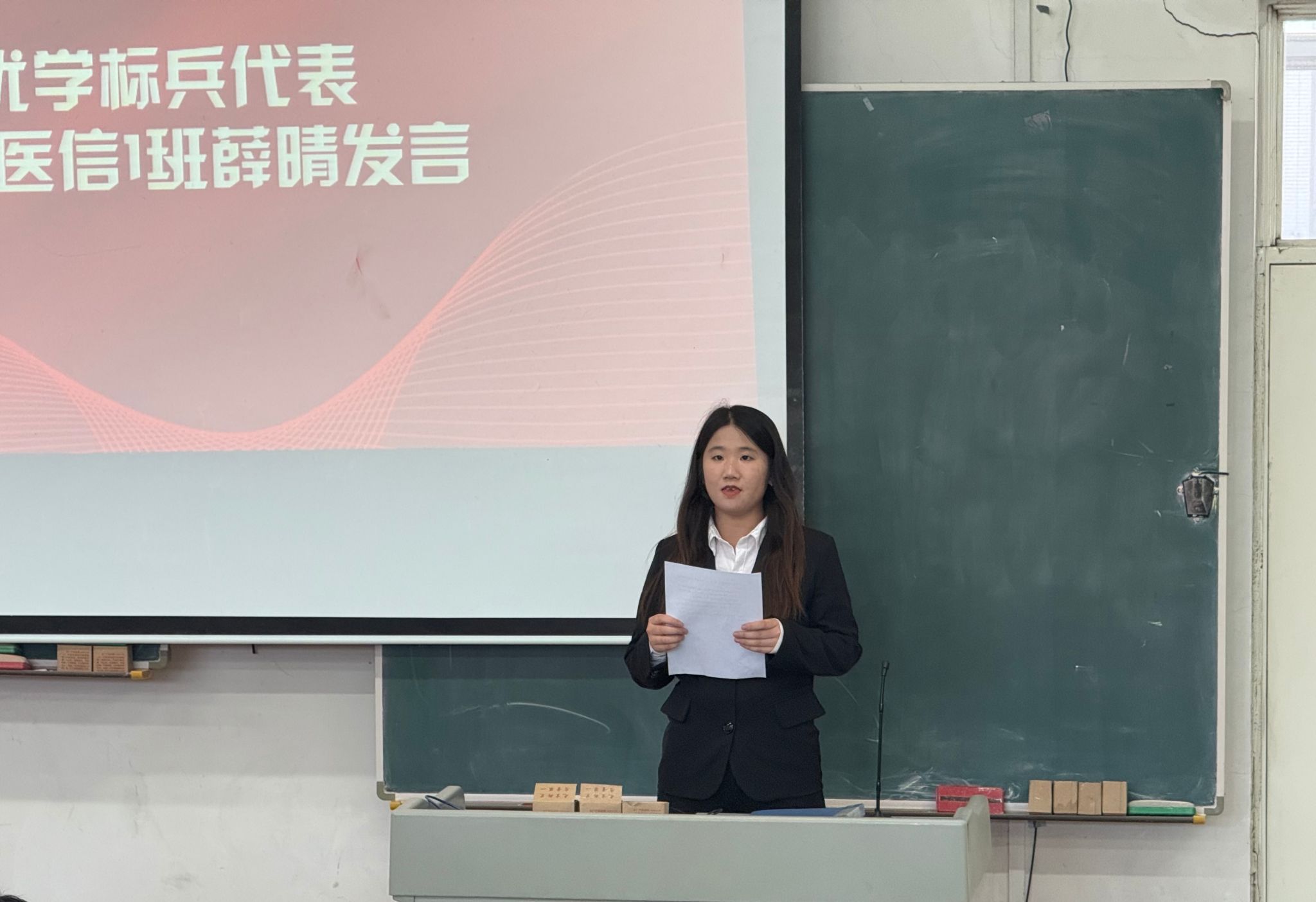 活动伊始,优学标兵代表薛晴、乐学标兵代表董科涵、学习进步奖代表胡晓曼依次发言,分享学习心得与成长感悟,激励同学们积极进取。随后,史晓菲老师宣读表彰决定,秦婧老师颁发个人奖项,韦家勇书记颁发集体奖项,对在上学期“三学两争创”活动中表现优异的个人和集体予以表彰。