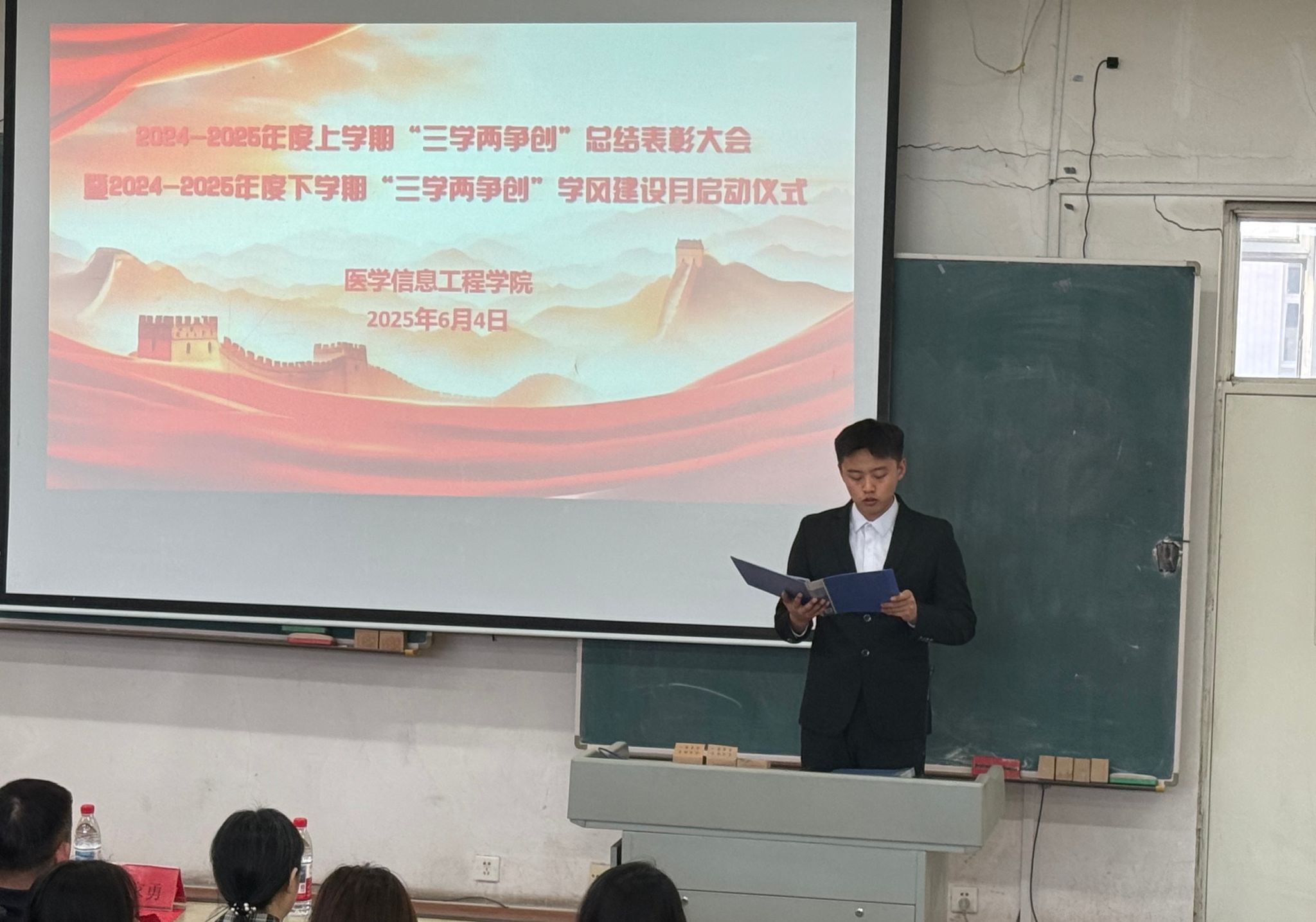 6月4日晚,WilliamHill中文官方网站在博学楼A座阶梯教室举行2024-2025学年度上学期“三学两争创”总结表彰大会暨2024-2025学年度下学期学风建设月启动仪式。领导及师生代表一百五十余人共同出席活动。